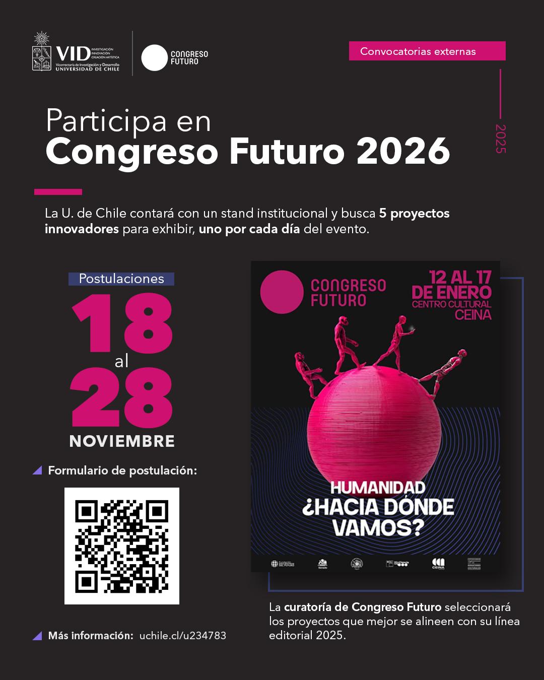 La Universidad de Chile invita a toda su comunidad a postular a la Feria de Innovación de Congreso Futuro 2026. La U. de Chile contará con un stand institucional, donde se exhibirán cinco proyectos innovadores, uno por cada día del evento.