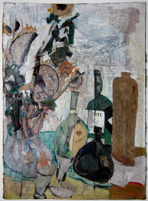 Natura morta con bottiglie e brocca (Naturaleza muerta con botella y jarra) es representativa de la transición de Pirandello desde el influjo cubista a la abstracción e informalismo. Aunque se desconoce la fecha exacta de esta obra, se estima que fue realizada en 1954, siendo los años cincuenta un período de grandes logros y reconocimiento a su trayectoria por parte de la crítica especializada, entre ella la del propio Ventura, quien había regresado a Italia en 1945, tras un exilio en París y Nueva York, sumándose con ahínco a la escena italiana de post guerra.
