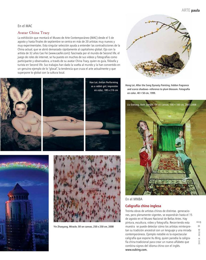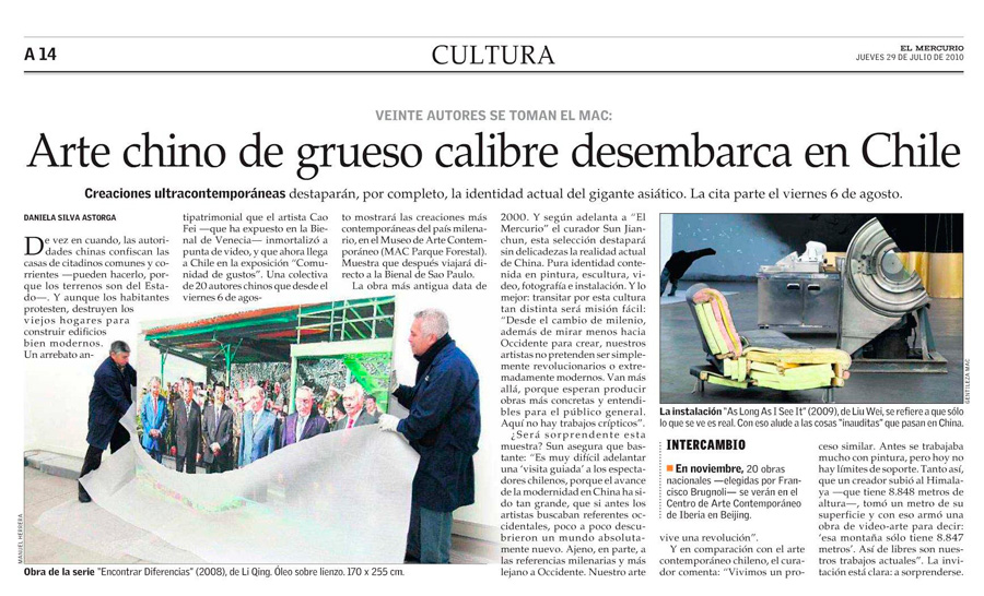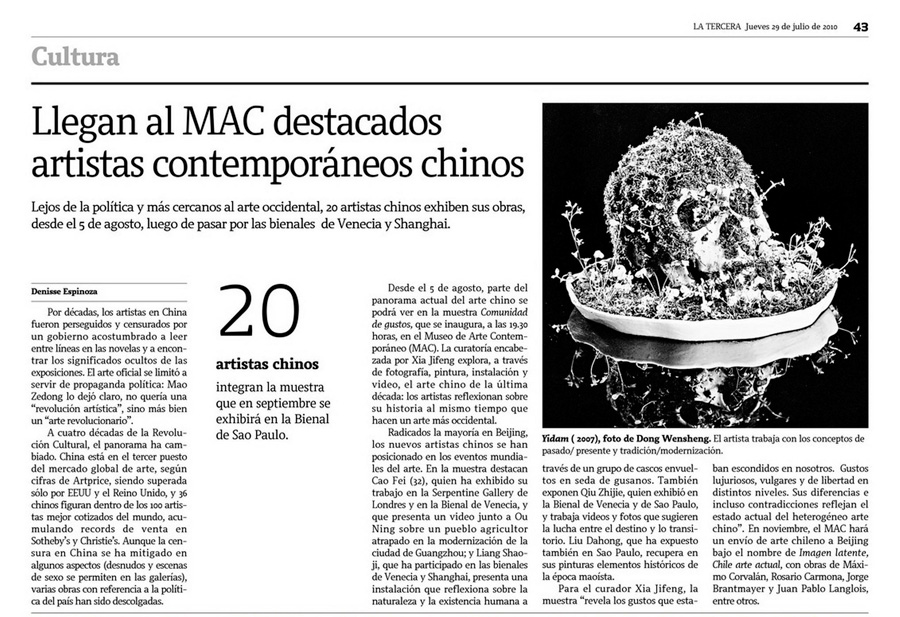 Bajo la curatoría principal de Xia Jifeng y el equipo curatorial conformado por Zuo Jing, Sun Jianchun (China), esta muestra explora en los diversos campos del arte contemporáneo, por medio de un ejercicio de intercambio y exhibición a gran escala que reunirá en el MAC Parque Forestal a más de 20 artistas chinos, entre los que figuran Ou Ning & Cao Fei quienes exponen San Yuan Li, un video que fue exhibido en la 50 Bienal de Venecia. Cao Fei ganó además el Best Young Artist Award of Chinese Contemporary Art Awards (CCAA) en 2006, el premio al mejor artista joven de los premios de arte contemporáneo chino. Liang Shaoji, quien ha expuesto en las bienales de Venecia y Shangai y fue galardonado en 2009 con el Premio Príncipe Claus de Holanda, exhibe la instalación serie Cascos/Naturaleza. También exponen Qiu Zhijie que exhibió en la Bienal de Venecia y Wang Jianwei quien ha expuesto en la Bienal de São Paulo, entre otros artistas de destacada trayectoria en China y a nivel internacional.