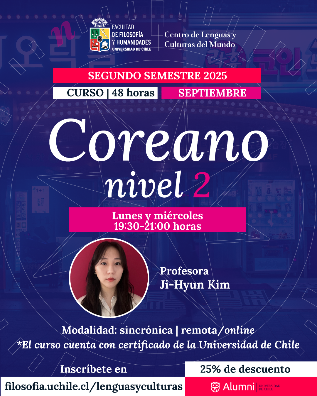 La profesora Jihyun Kim es licenciada en Lingüística y Literatura Inglesas por la Universidad de Chile, Licenciada en Enseñanza de Coreano como lengua extranjera con Certificación oficial de profesora de lengua coreana otorgado por el Gobierno coreano y Diplomada en formación para docentes coreanos por la Universidad Nacional de Seúl, Corea.