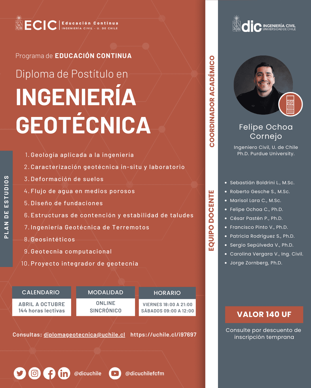 Los nuevos desafíos que el mundo enfrenta con el cambio climático, aumento en uso de espacio subterráneo, el impulso de energías renovables, extensiones de redes de transporte, infraestructura minera, rutas interurbanas y proyectos urbanos, todos de alta complejidad, en los cuales la ingeniería geotécnica cumple un rol vital, abren aún más oportunidades de desarrollo y trabajo para nuestros ingenieros e ingenieras geotécnicas. Este diploma se dicta anualmente desde 2025.