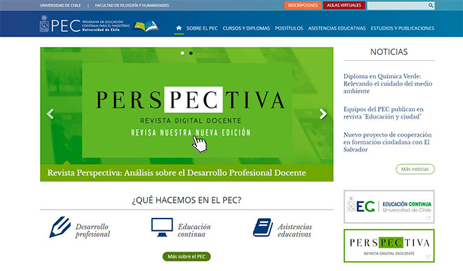 Con el objetivo de visibilizar el trabajo de capacitación, formación y asistencia pedagógica que el Programa de Educación Continua para el Magisterio (PEC) de la Facultad de Filosofía y Humanidades desarrolla desde 1999, se llevó a cabo la renovación de su sitio web www.pec.uchile.cl.