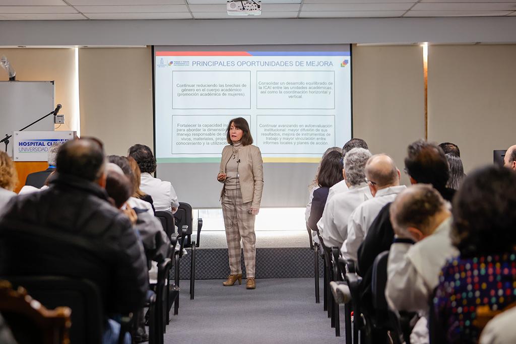 El proceso de acreditación institucional constituye también un ejercicio reflexivo orientado a fortalecer los mecanismos de aseguramiento de la calidad. En este marco, la Comisión Superior de Autoevaluación Institucional y las comisiones locales desempeñaron un rol decisivo, aportando información cualitativa clave para la elaboración del informe de autoevaluación. En términos generales, la Universidad de Chile ha consolidado y transversalizado su sistema interno de aseguramiento de la calidad, que abarca la autoevaluación institucional, la evaluación y calificación académica y funcionaria, así como la calidad de los programas de pregrado y postgrado. En lo relativo al Hospital, la prorrectora subrayó los avances en gestión de calidad y excelencia sanitaria, destacando el trabajo de la Dirección de Calidad y la acreditación sanitaria obtenida, con un 97% de cumplimiento.