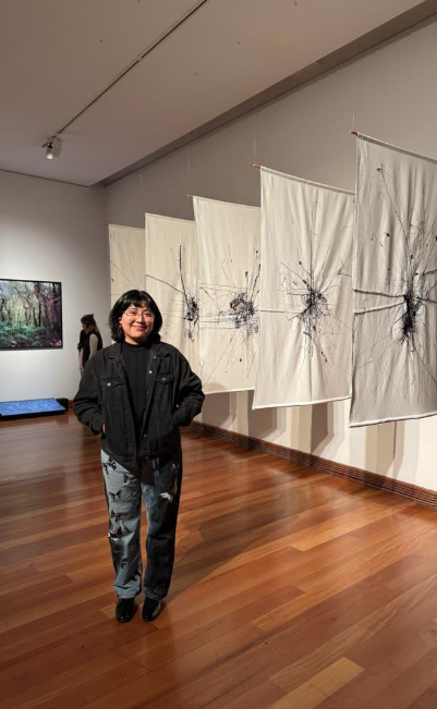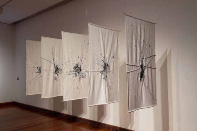 Por su parte, la obra Marañas (2024) de Caroline Villena Ramírez, también egresada del DAV, obtuvo una mención honrosa en esta XVIII edición del Premio. “Marañas es una instalación textil que consta de cinco paños blancos, los cuales fueron serigrafiados con tinta blanca, cosidos y bordados con diversos hilos negros. Esta obra nace del encuentro fortuito con un poste de luz repleto de cables en la Villa Santa Anita de Lo Prado, lugar en el que me crié hasta los cinco años y que he frecuentado constantemente. Debido a la cotidianeidad y familiaridad con el territorio el estado de aquellos cables me habían pasado desapercibido. A partir de ese momento comencé a recorrer el sector, buscando y fotografiando postes en el mismo estado. Seleccionando cinco de ellos para ser traspasados al textil a través de la serigrafía, y posteriormente intervenidos con hilos negros que recrean y ficcionan la maraña de cables mediante la costura y el bordado, creando así dos marañas en una misma pieza: la del derecho y la del revés”, detalla Villena.