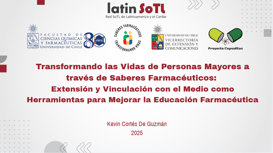 El estudiante de Química y Farmacia e integrante de Capsulitas, Kevin Cortés de Guzmán, presentó la ponencia “Transformando las Vidas de Personas Mayores a través de Saberes Farmacéuticos: Extensión y Vinculación con el Medio como Herramientas para Mejorar la Educación Farmacéutica”. En su presentación, Cortés de Guzmán abordó el envejecimiento poblacional como un desafío para los sistemas de salud, enfatizando la necesidad de enfoques pedagógicos innovadores que conecten el conocimiento académico con comunidades vulnerables, como la comuna de Pedro Aguirre Cerda en Chile, la cual posee un alto índice de envejecimiento y vulnerabilidad socioeconómica.