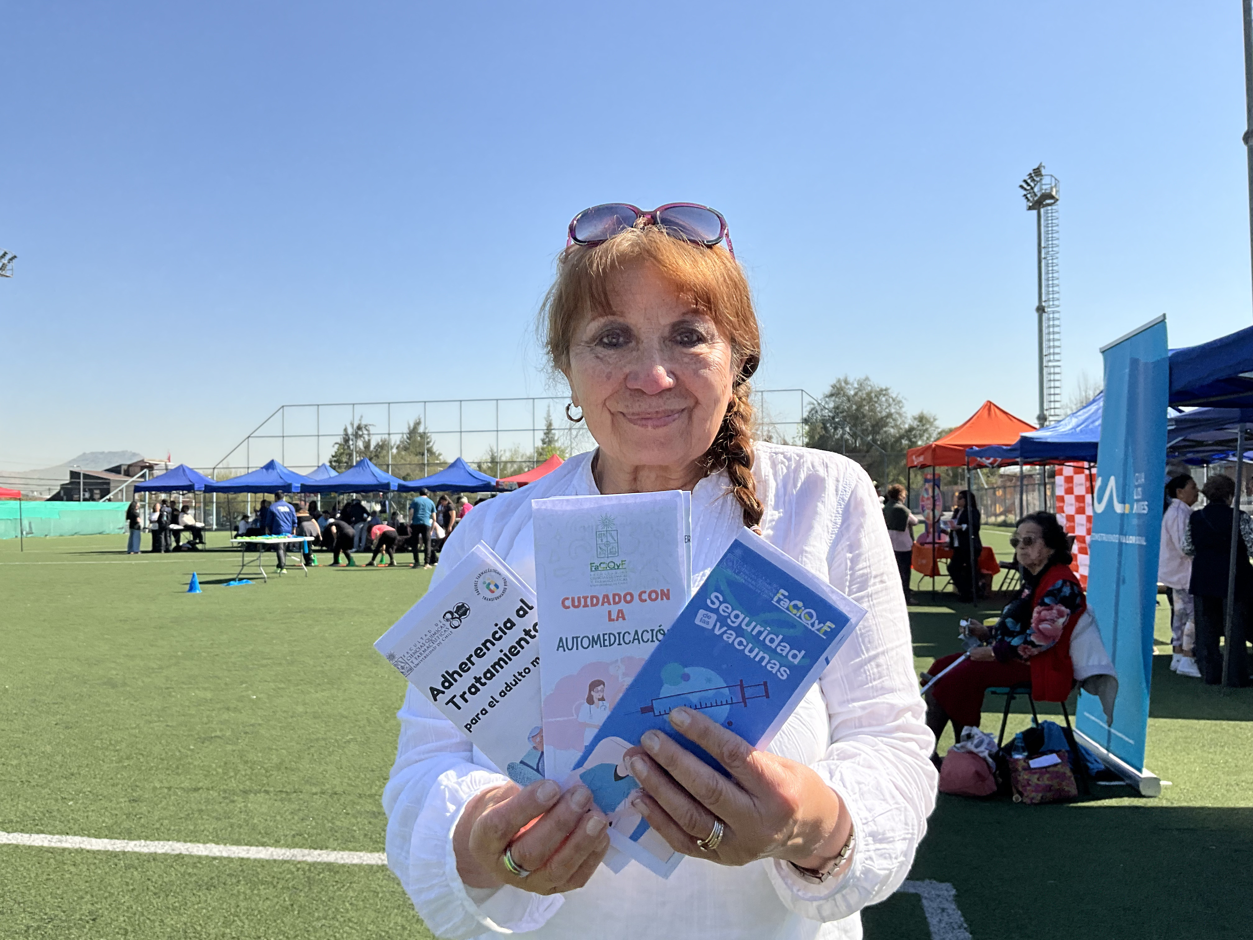 Entre las asistentes al stand estuvo Alicia Orguín Martínez, integrante de un grupo de personas mayores, quien valoró tanto la información entregada como la cercanía de las y los estudiantes. “Me acerqué porque todo me llama la atención y pedí un folleto para compartirlo después en nuestros talleres de área cognitiva”, comentó. Alicia señaló que uno de los principales desafíos para las personas mayores es el olvido en la toma de medicamentos, lo que puede traer consecuencias para su salud. En su caso, explicó que mantiene un orden estricto con una cajita organizadora para no descuidar sus tratamientos. Además, destacó la importancia de la interacción entre generaciones, subrayando lo valioso que resulta para este grupo etario recibir a estudiantes y profesionales jóvenes en sus espacios comunitarios: “Ese contacto es como una renovación de sangre; nos permite conocernos, respetarnos e intercambiar experiencias”.