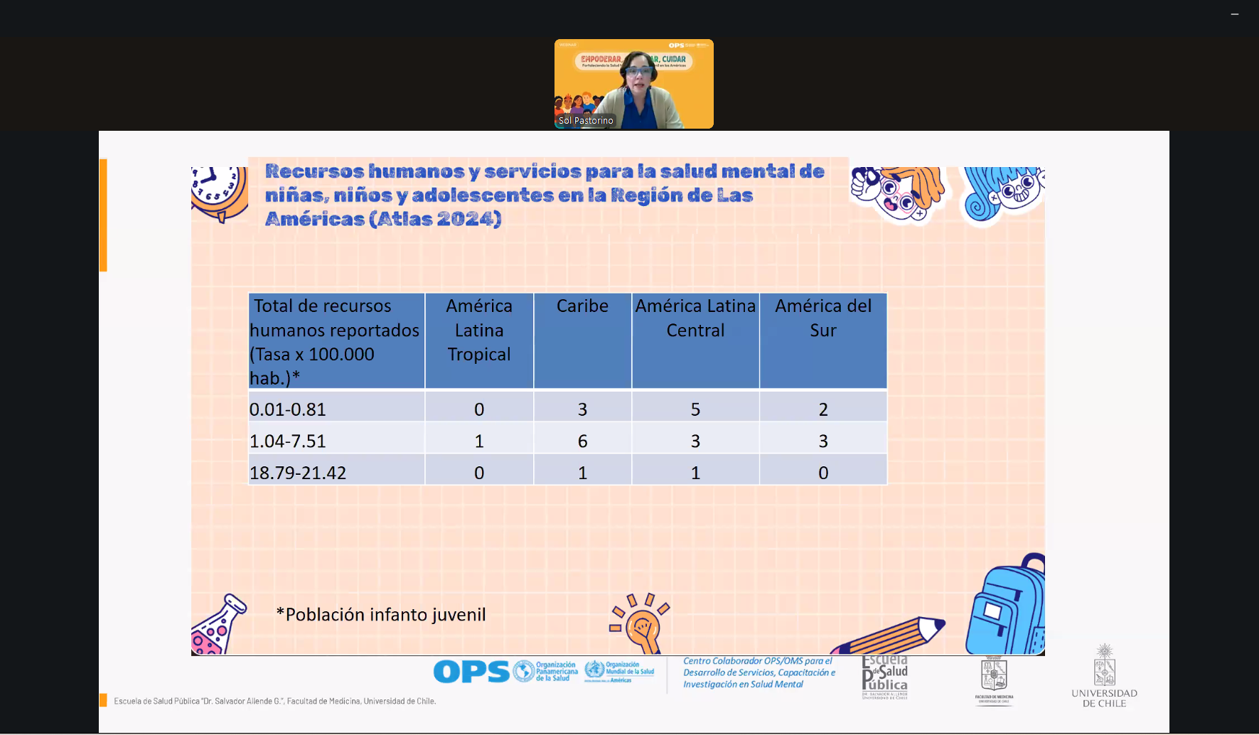 Durante el encuentro, María Sol Pastorino, académica del Programa de Salud Mental de la Escuela de Salud Pública de la Universidad de Chile y representante del Centro Colaborador OPS/OMS para el Desarrollo de Servicios, Capacitación e Investigación en Salud Mental, presentó un análisis regional basado en los datos del Atlas de Salud Mental 2024.