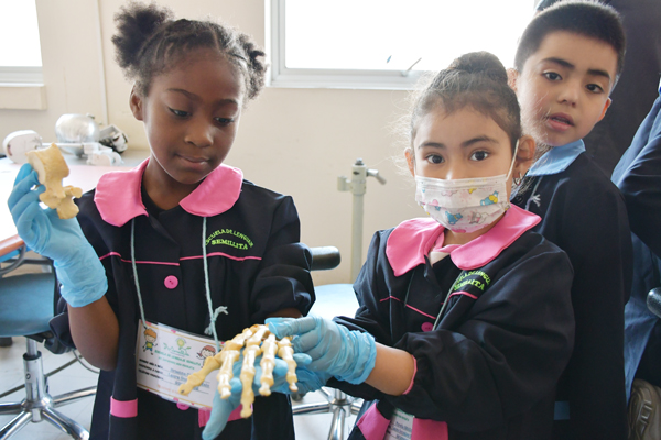 En otro de los momentos de aprendizaje, la Dra. Viviana Toro Ibacache, académica del Instituto de Investigación en Ciencias Odontológicas (ICOD) e integrantes del cuerpo académico del Área de Anatomía, se enfocaron en la Morfología y el autocuidado, utilizando material educativo para que los niños conocieran el esqueleto humano, emplazados en los Preclínicos FOUCh.