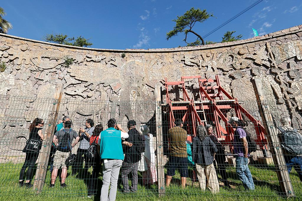 Finalmente, en el recorrido del mural, Correa detalló cómo se avecina el proceso de restauración que se extenderá durante ocho meses. “El equipo se encuentra trabajando en una primera etapa de intervención en la que hicimos la consolidación de emergencia de figuras muy pesadas. También hicimos estudios geofísicos con ondas de radio que nos permitieron identificar el sistema constructivo y comprender la técnica, y realizamos ensayos que permitieran orientar mejor la restauración. Realizamos un catálogo de las piedras que requieren ser repuestas”.
