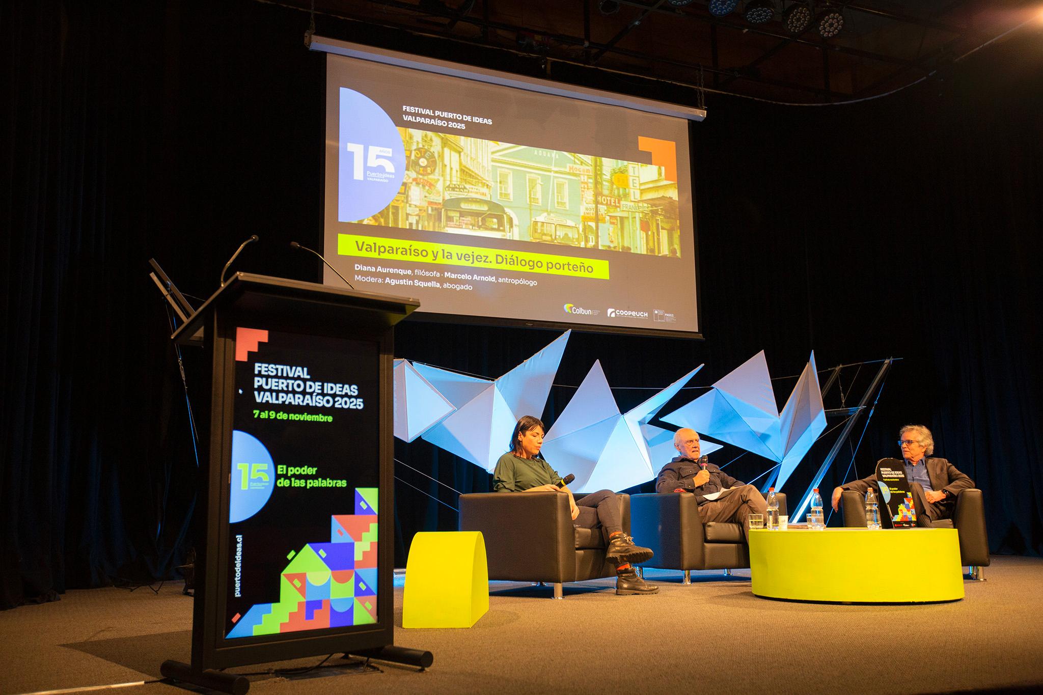 "La vejez, tenemos la seguridad, de que es la última estación del metro, y hay que descender", con esta reflexión del periodista y filósofo comenzó la conversación -moderada por él- entre la filósofa y comunicadora, Diana Aurenque y el antropólogo y Doctor en Ciencias Sociales, Marcelo Arnold, quienes protagonizaron un encuentro que inició la segunda jornada de Puerto de Ideas Valparaíso 2025.