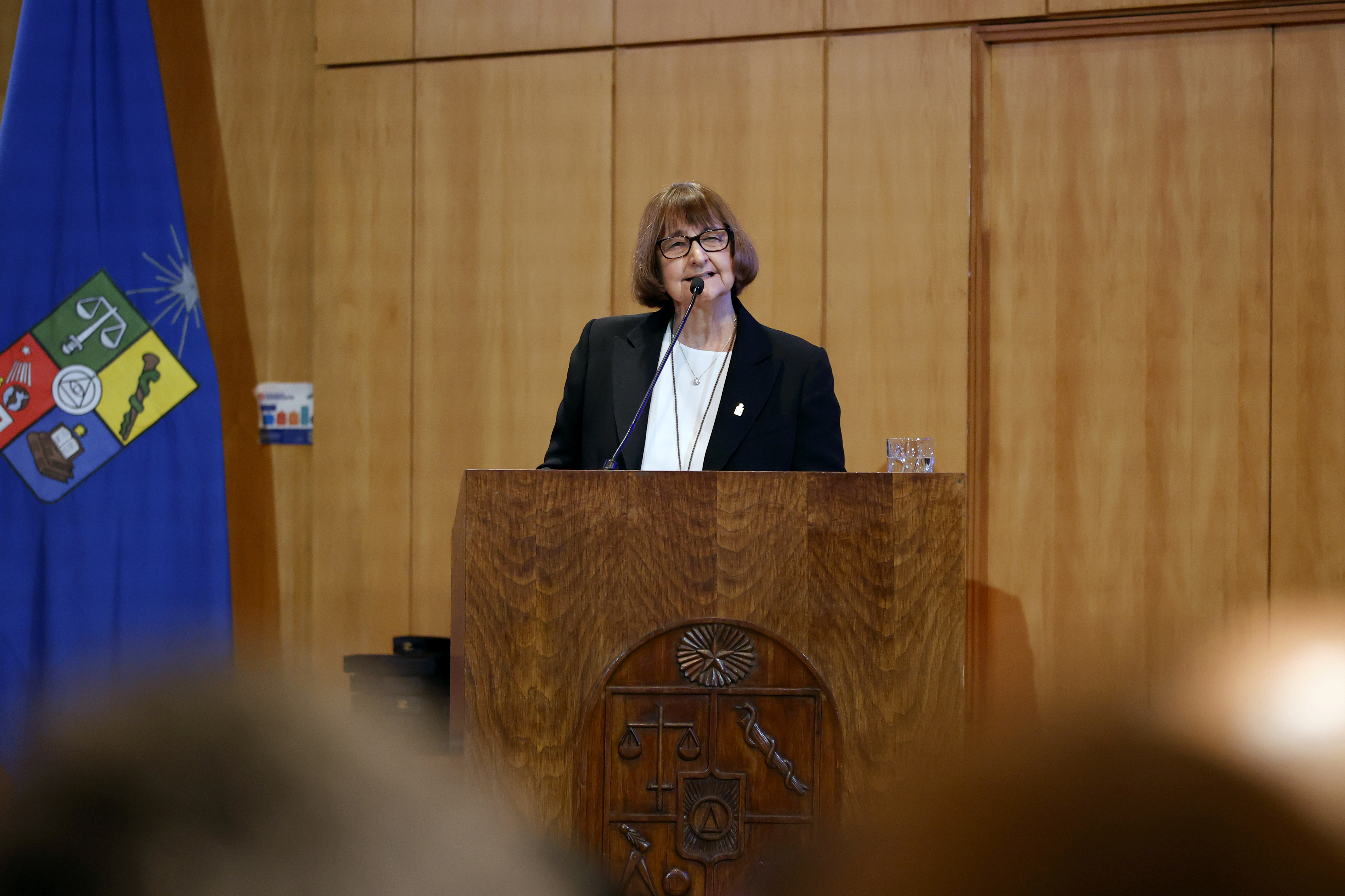 En su intervención, la rectora destacó la vocación pública de la institución y el vínculo profundo que la une a Chile desde su creación. “Desde su fundación, la Universidad de Chile ha estado indisolublemente ligada al devenir del país. Quienes la conformamos sabemos que nuestra labor trasciende lo individual y cobra pleno sentido en su vínculo con la sociedad. Ese es nuestro ethos”, señaló. La autoridad subrayó la importancia de preservar la ciencia, la educación pública, la libertad académica y el diálogo razonado como pilares esenciales de la misión universitaria.