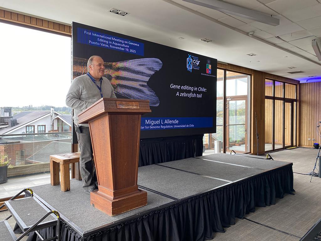 El profesor Miguel Allende, académico de la Facultad de Ciencias y director del Instituto Milenio Centro de Regulación del Genoma de la Universidad de Chile, compartió en el Primer Seminario Internacional de Edición Genómica en Acuicultura los alcances de la edición genética en Chile usando como modelo el pez cebra y el rol de la academia en la generación de conocimiento de frontera.
