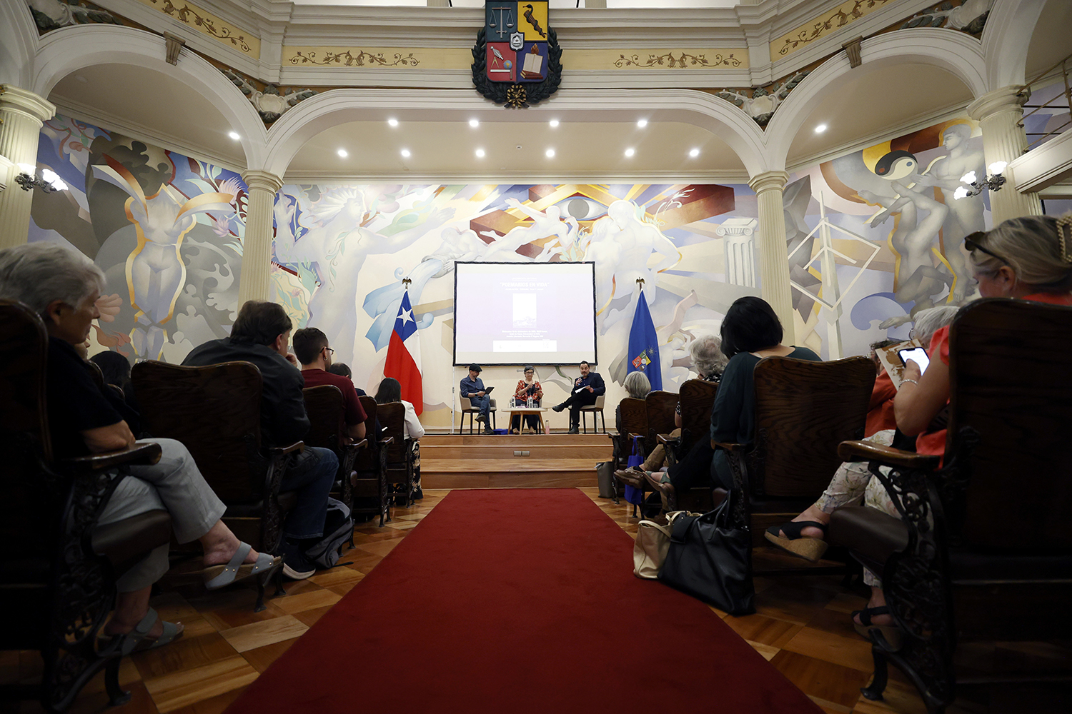 La jornada continuó con un conversatorio en torno a la obra de Mistral, que contó con la presencia de la académica de la Facultad de Filosofía y Humanidades, Soledad Falabella y Adrián Baeza, de la misma unidad académica.
