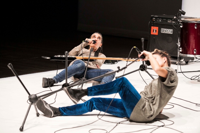 Sigo trabajando sobre el “yo no soy”, pero en “Polifonía” estoy intentando llegar hacia el “nosotras no somos”. También sacamos la base rítmica de “Negarlo todo” (bajo y batería) porque lo que quiero ahora es ir más hacia el cuerpo. En “Negarlo todo” el cuerpo para mí está súper presente, pero el foco más fuerte está en el discurso, porque el cuerpo se activa en relación a la palabra dicha o al sonido de la voz. Ahora, en “Polifonía”, la operación está siendo que el cuerpo danzante aparezca con mayor fuerza en relación al discurso, pero también con autonomía al mismo, empezamos con “yo no soy” y vamos al “nosotras”.
