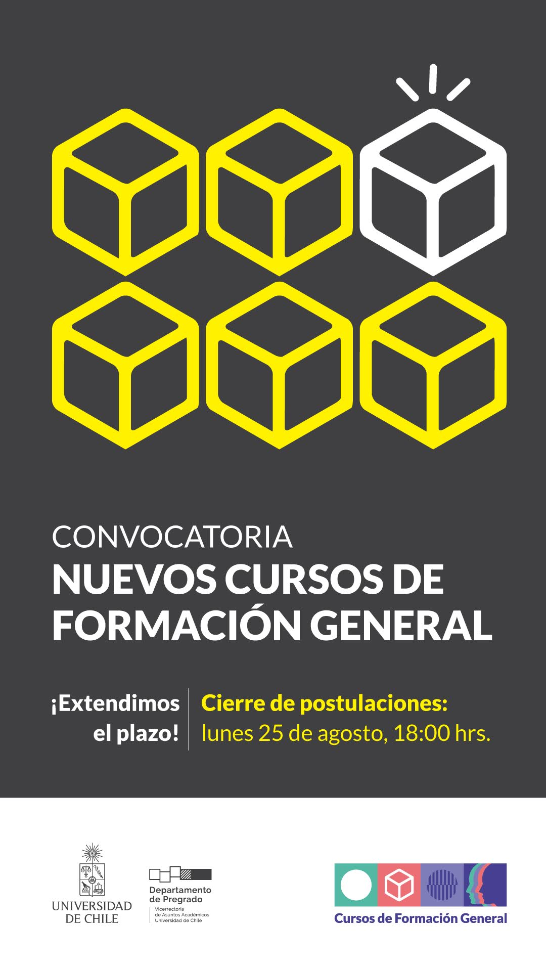 A esta convocatoria puede postular cualquier académica o académico de la Universidad de Chile y el único medio de postulación es el Formulario de Postulación Convocatoria a presentar propuestas de nuevos Cursos de Formación General (CFG) 2026, que se encontrará abierto hasta el hasta el lunes 18 de agosto lunes 25 de agosto, a las 18:00 horas.