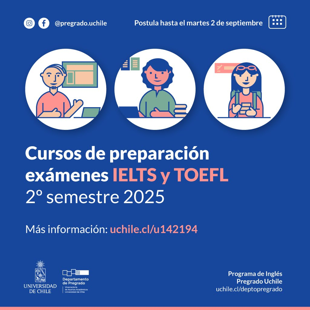 Importante: la Universidad de Chile no aplica ninguno de los exámenes para los cuales preparan estos cursos y tampoco cuenta con convenios ni becas para rendirlos. La inscripción y rendición de estos tests es de exclusiva responsabilidad de las y los estudiantes, quienes pueden informarse de los valores, fechas y lugares de rendición de cada test en los sitios oficiales: https://www.ets.org y https://www.ielts.org.