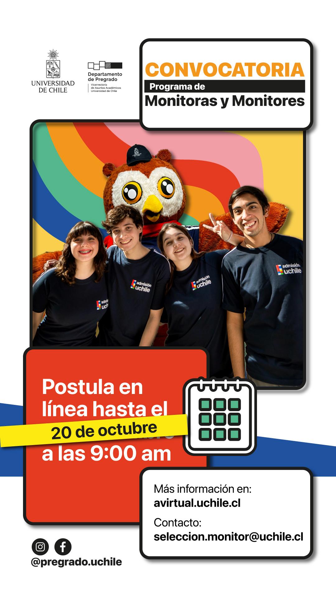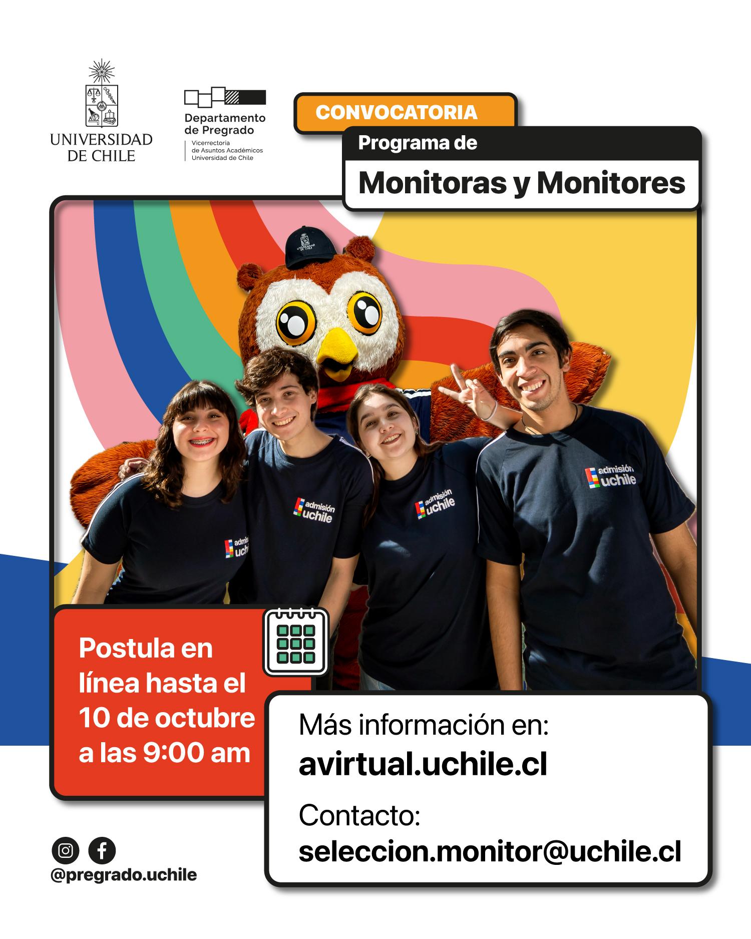 Si te entusiasma esta invitación, te animamos a leer las Bases de la Convocatoria de Programa Monitoras y Monitores U. de Chile - Septiembre 2025, revisar si cumples con los requisitos y postular a través del Formulario de Postulación Convocatoria Monitoras y Monitores Uchile Admisión 2026, que estará disponible hasta el próximo lunes 20 de octubre de 2025, a las 9:00 hrs.