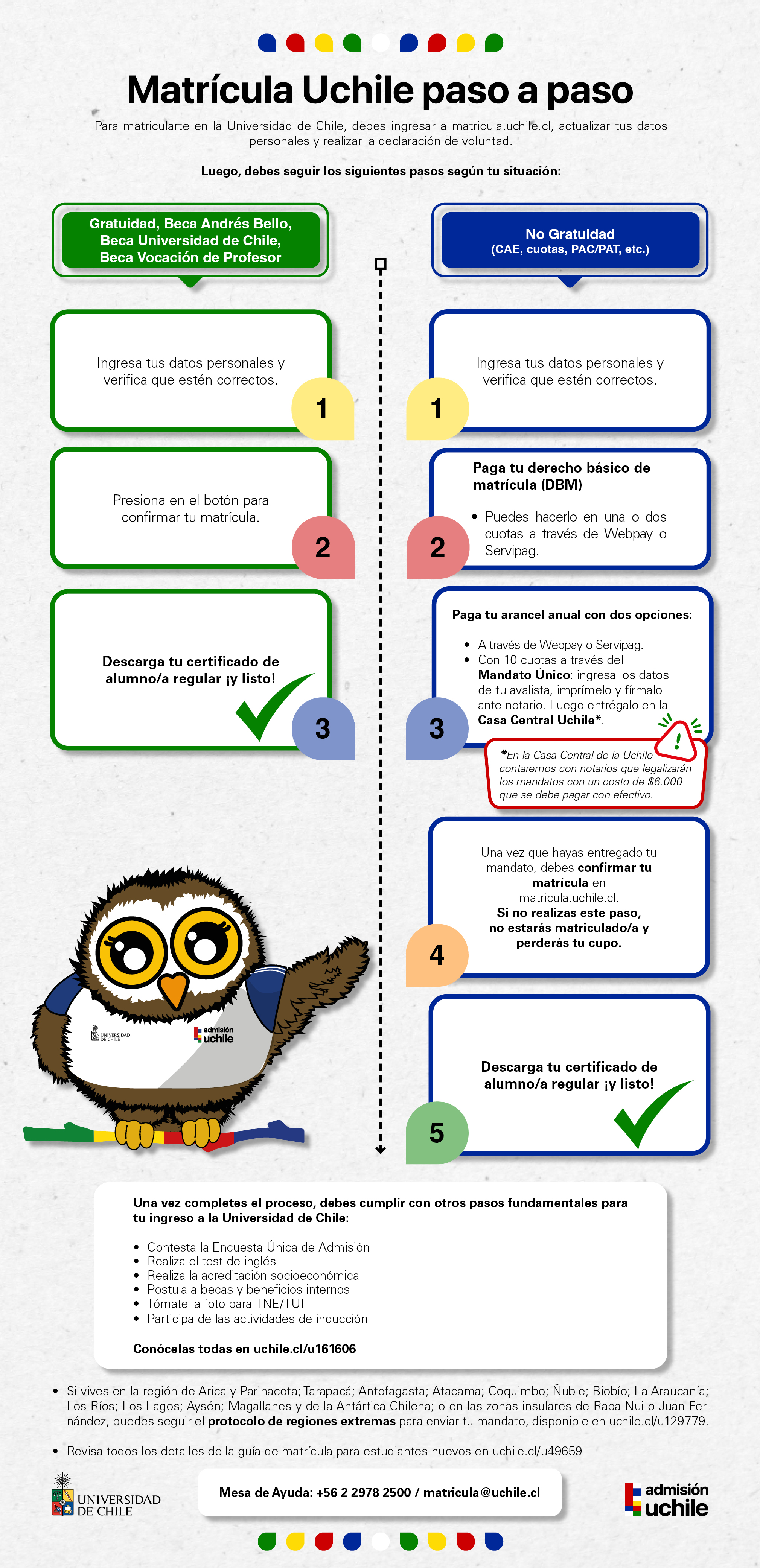 Ten en cuenta que utilizararemos este sitio web uchile.cl y nuestras redes sociales indicadas en el contenido Asistencia en línea a las y los Postulantes como fuente oficial de información sobre el Proceso de Matrícula. En ese sitio podrás revisar más detalles sobre dónde, cuándo y cómo resolver todas tus dudas.