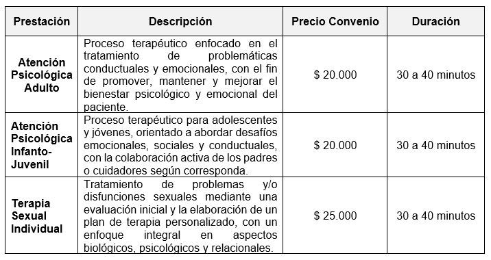 Ofrece a los(as) socios(as) de Bienestar del Personal y su grupo familiar atenciones con valores preferenciales en todas sus especialidades y sucursales, incluyendo la plataforma de Terapia Online.
